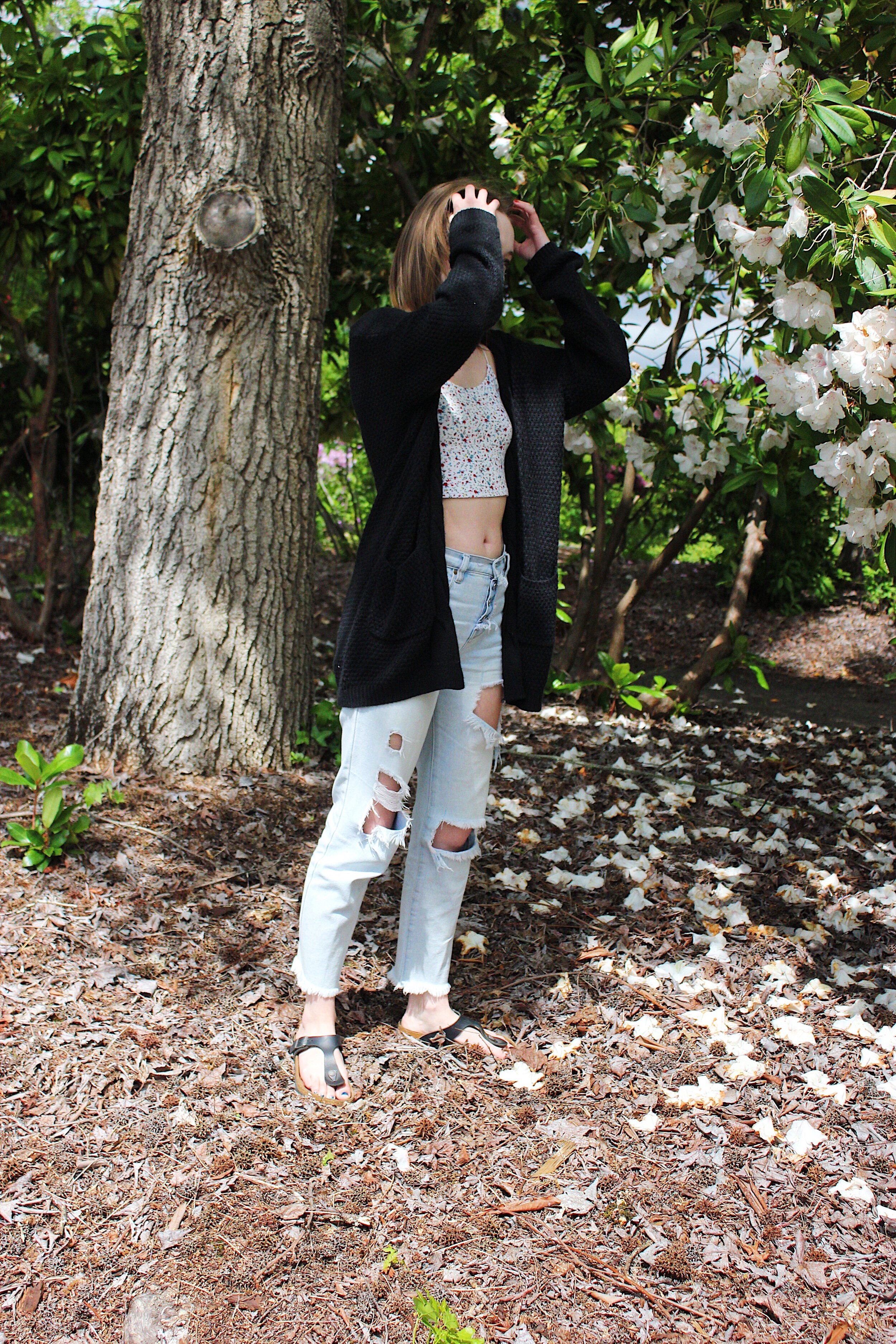 I am one of the only people I know who love denim. Jeans, jackets, skirts, shorts all of them! I live in them and have a bunch of different washes and styles. The only thing I have more of is sweatshirts and I love those equally as much as all of my jeans. This outfit in the post is my favorite, go-to outfit for all in-between weather. I wear it in this current season where it is warm and cold and rainy and windy all in the same day, as well as in the transition from summer to fall. It is comfortable and casual which is perfect for any regular day out. Or in the case of quarantine, a day in. With certain orders loosening up in Oregon, we were able to go to a park for the first time in months to be able to take these photos, and for that, I am extremely grateful.